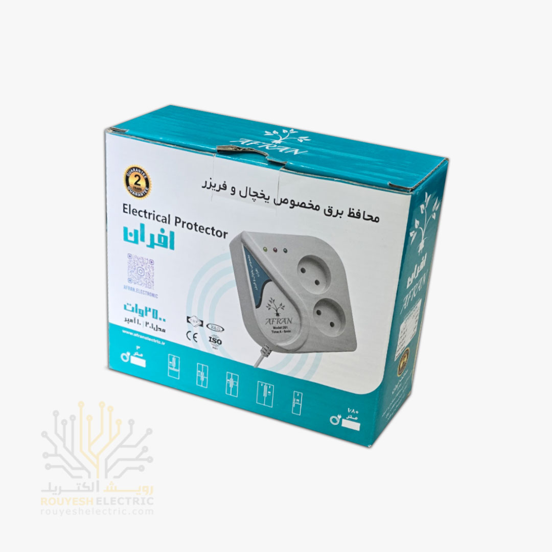 محافظ برق یخچال برند افران استاندارد، یک دستگاه محافظتی دیواری دو خانه با عملکرد آنالوگ و کابل ۳ متری است که جهت حفظ ایمنی یخچال‌ها، فریزرها و تجهیزات سرمایشی در برابر نوسانات برق، افت ولتاژ، و قطع‌ و وصل ناگهانی جریان طراحی شده. طول کابل بیشتر در این نسخه باعث افزایش انعطاف‌پذیری نصب در محیط‌های بزرگ‌تر و مکان‌های دور از پریز می‌شود.