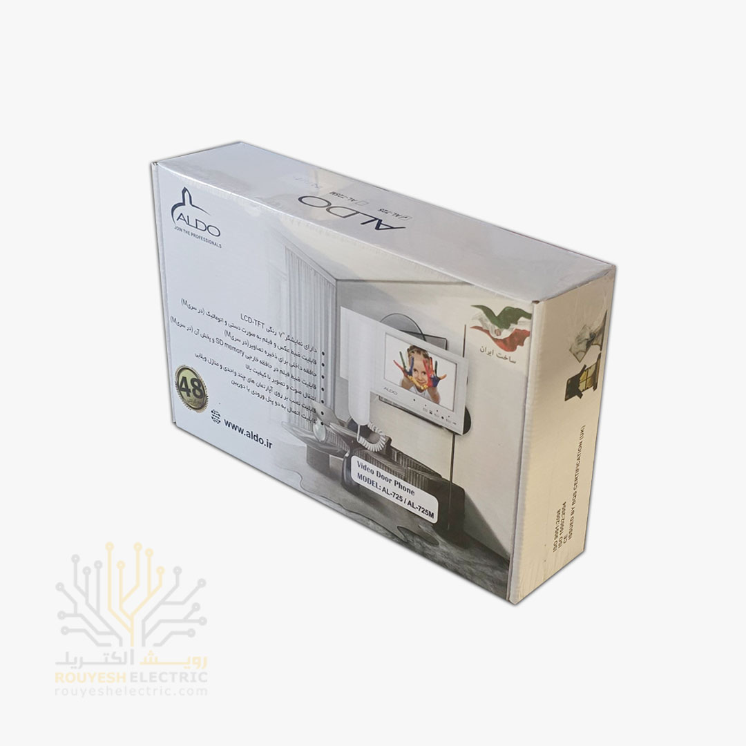 مانیتور 7 اینچ برند الدو مدل 725 بی حافظه سفید موجود در شرکت ما تولید کشور ایران می باشد.از مزایای این محصول می شود به تنوع قابلیت های مختلف در پنل ها، مانیتور بزرگ با نمایشگر 7 اینچی، قابلیت ثبت تصویر و ضبط فیلم چند ثانیه ای از شخص زنگ زننده و همچنین ضمانت تعویض یکساله آن اشاره کرد؛ ضمنا 2 سال ضمانت تعویض برد معیوب (جمعا 3 سال ضمانت ) از دیگر مزایای این مدل پنل آیفون تصویری می باشد.