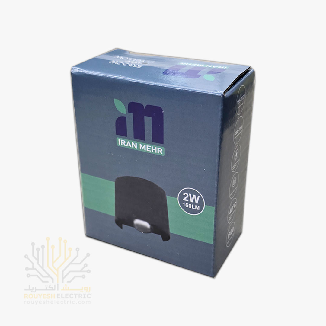 چراغ دیواری دکوراتیو 2 وات برند ایران مهر مدل قطاری بدنه آلومینیوم مشکی نور آفتابی