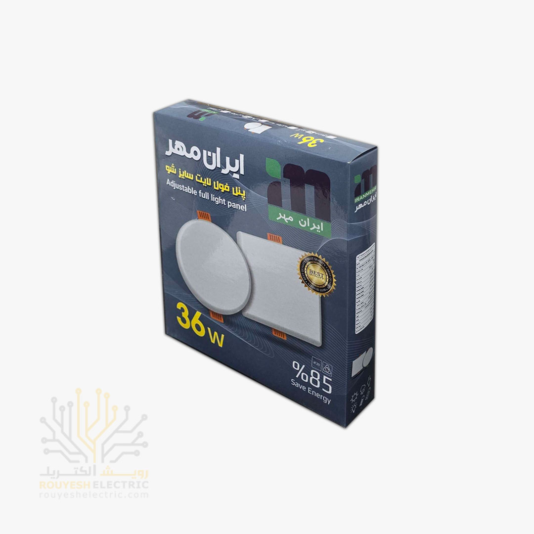 پنل سقفی توکار فول لایت 36 وات برند ایران مهر فنر متغیر دایره استاندارد رنگ مهتابی