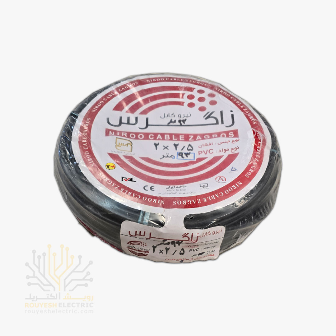 کابل برق نمره 2x2/5 برند نیرو کابل زاگرس استاندارد حلقه 93 متری