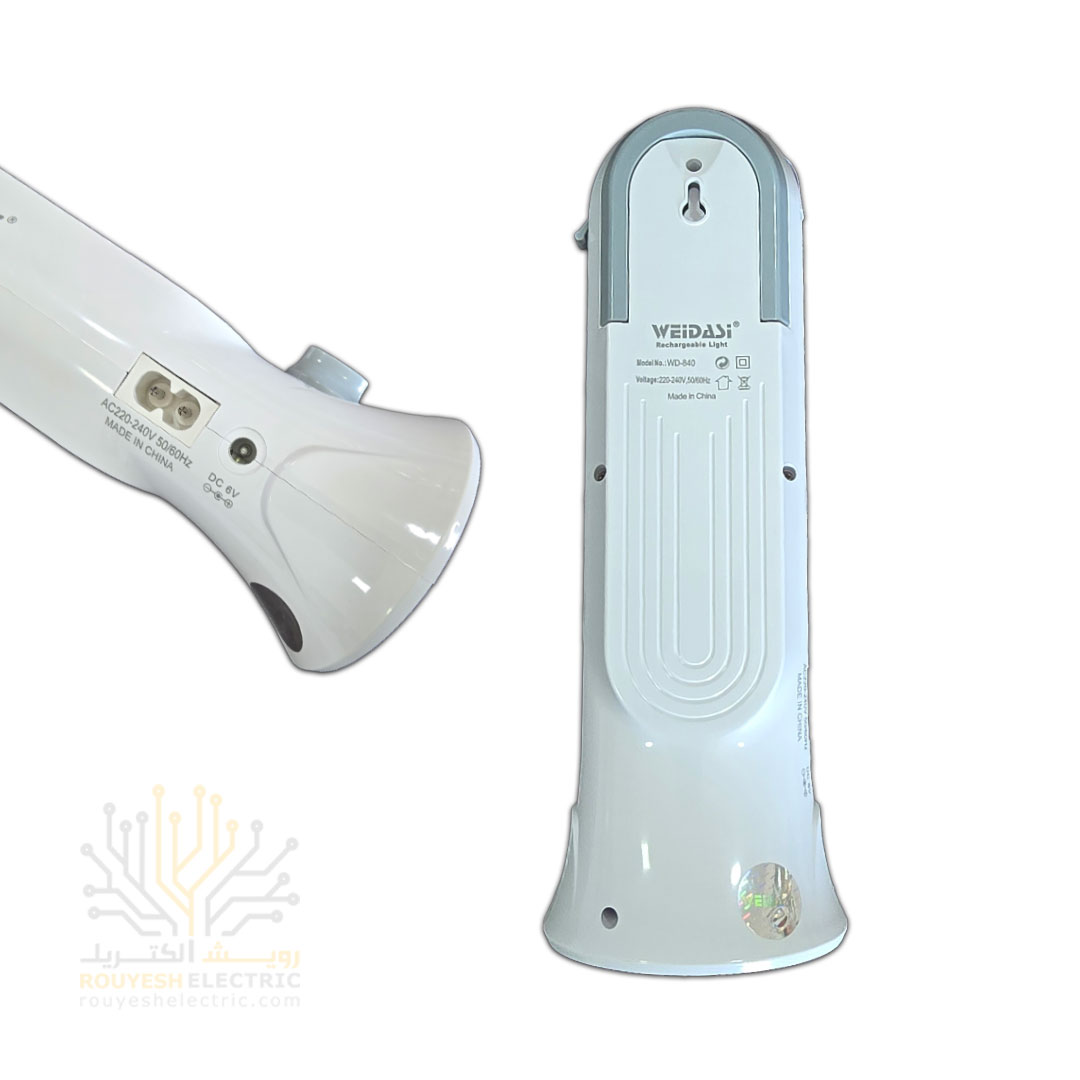 این چراغ مجهز به باتری داخلی قابل شارژ از نوع لید اسید با ظرفیت بالا است که از طریق برق شهری شارژ می‌شود. پس از شارژ کامل، می‌تواند بین ۳ تا ۵ ساعت نوردهی مداوم داشته باشد. چراغ WD-840 دارای ۱۵ تا ۲۰ عدد لامپ LED SMD با نور سفید است و با استفاده از ولوم تنظیم، شدت نور به‌صورت دلخواه قابل کنترل است. همچنین در صورت قطع برق، چراغ به‌طور خودکار روشن می‌شود.