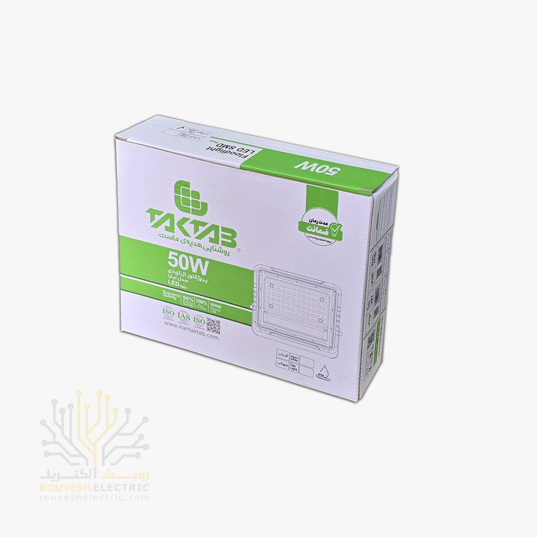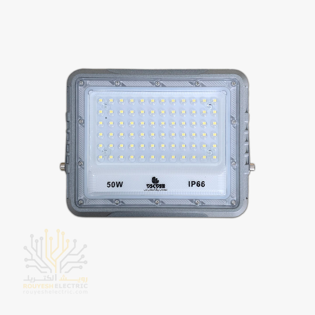 پروژکتور 50 وات SMD برند تک تاب مدل تیارا بدنه طوسی با درایور رنگ مهتابی