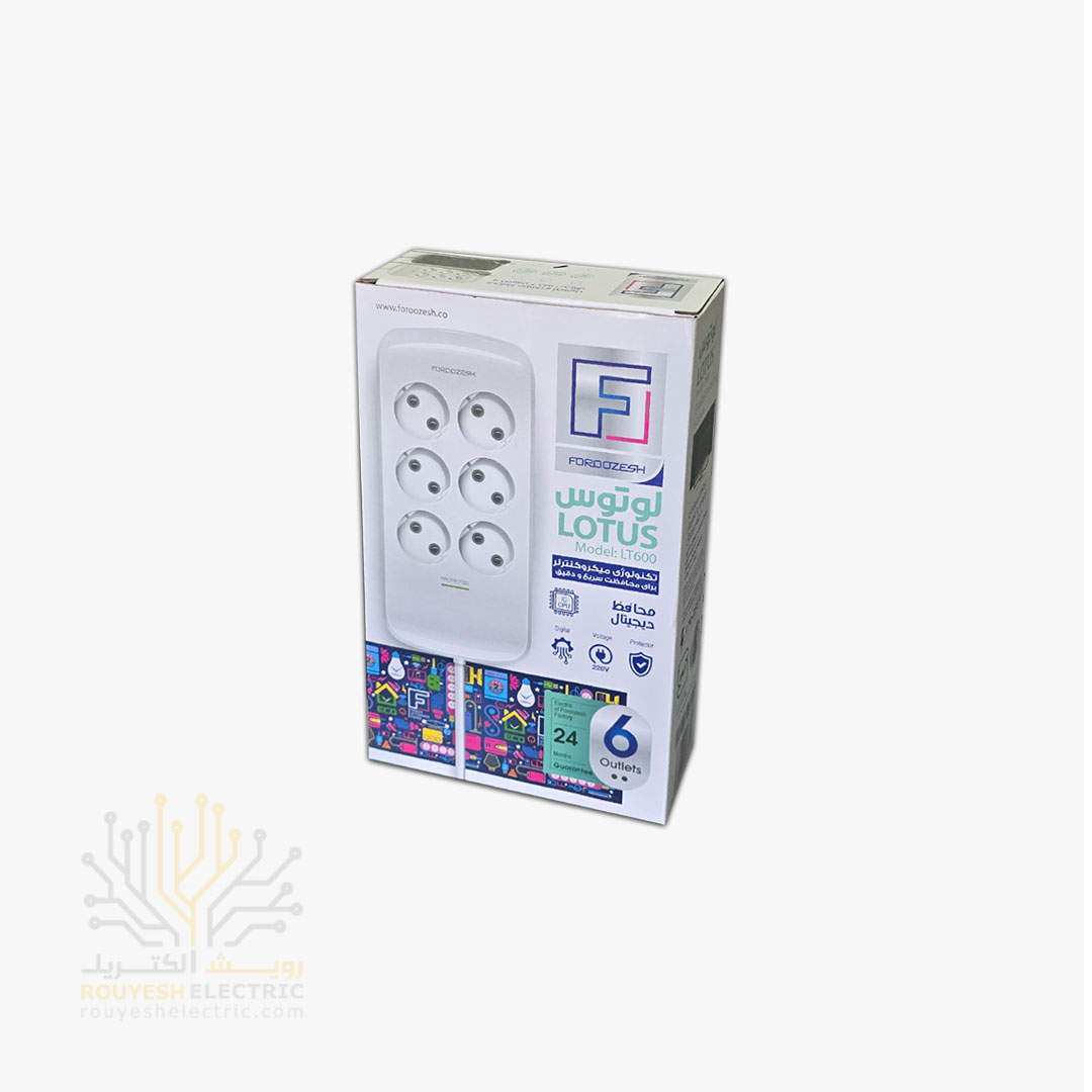محافظ برق کامپیوتر سیار شش خانه برند فروزش مدل LT600D لوتوس بدون ارت بدون کلید بدنه سفید دیجیتال 1/8 متری