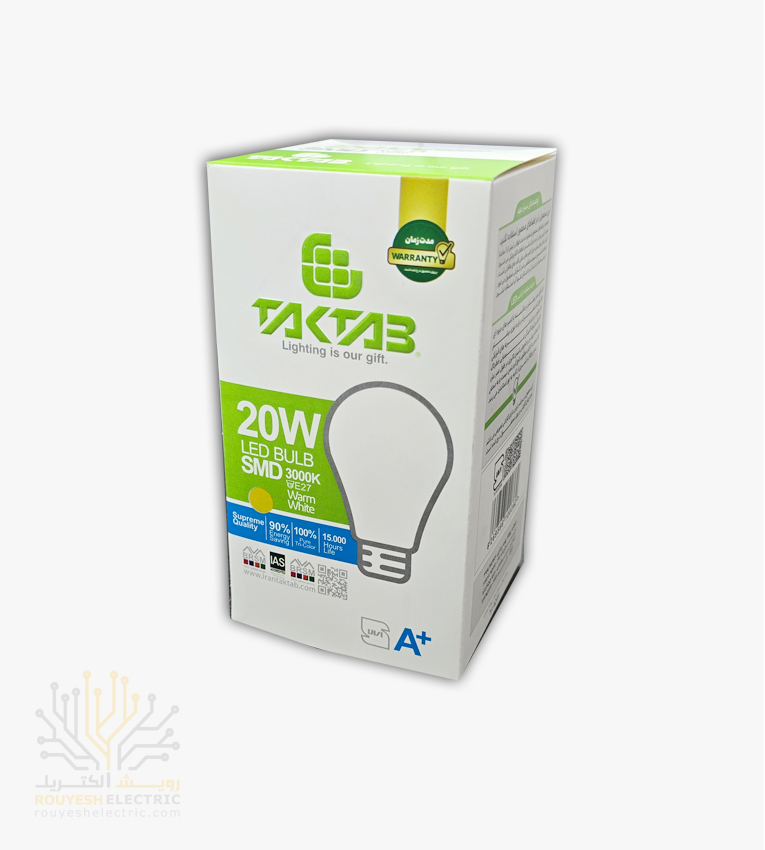 لامپ ال ای دی 20 وات حبابی برند تک تاب مهتابی موجود در شرکت ما تولید کشور ایران می‌باشد. از مزایای این محصول می‌توان به قیمت مناسب نسبت به سایر محصولات مشابه، دارا بودن نشان استاندارد و همچنین به ضمانت حداقل 15 ماه تعویض محصول اشاره کرد که خیال مشتریان را از بابت سلامت جنسی که تهیه می‌کنند، آسوده می‌سازد.