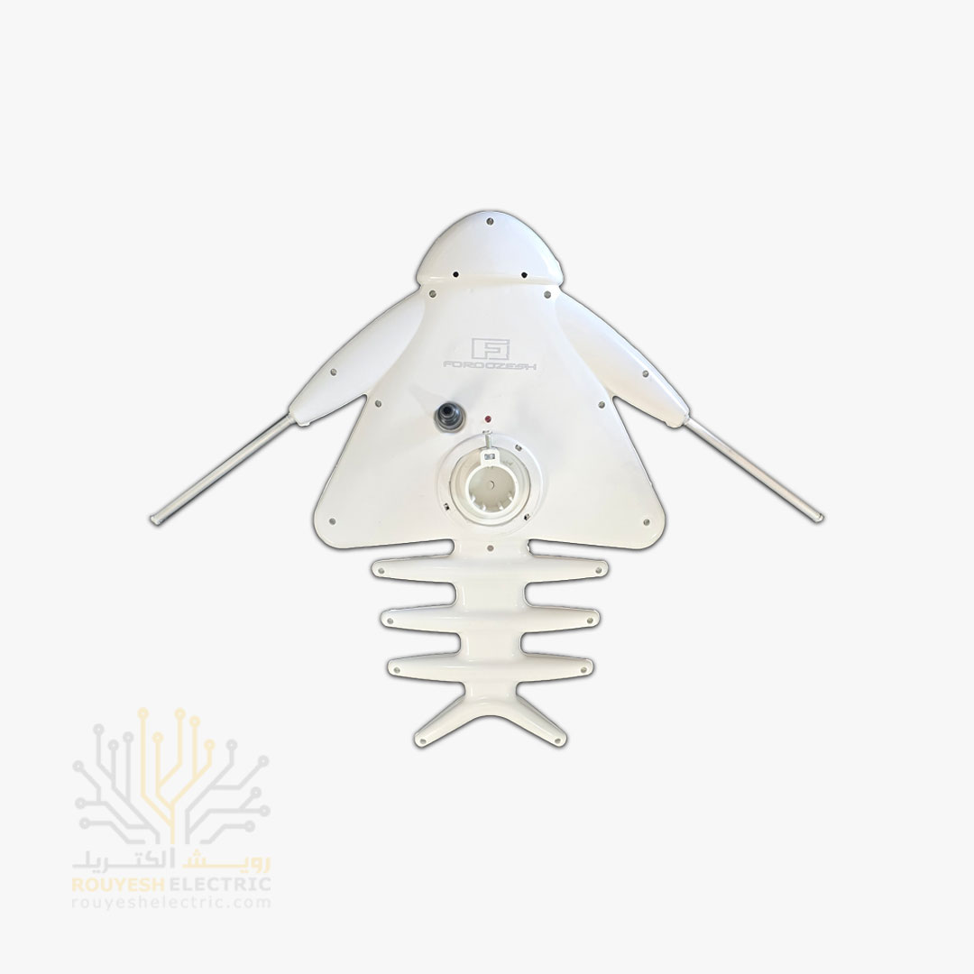 این یه آنتن برقی برای تلویزیونه که شکلش مثل موشک یا دنبالهداره، حدود نیم متر طول و 35 سانت عرض داره و بدنهش پلاستیکی و سفید رنگه. موتوری که داخلش قرار داده میتونه آنتن رو بچرخونه و دو خروجی داره که میتونی همزمان به دو تلویزیون وصلش کنی.