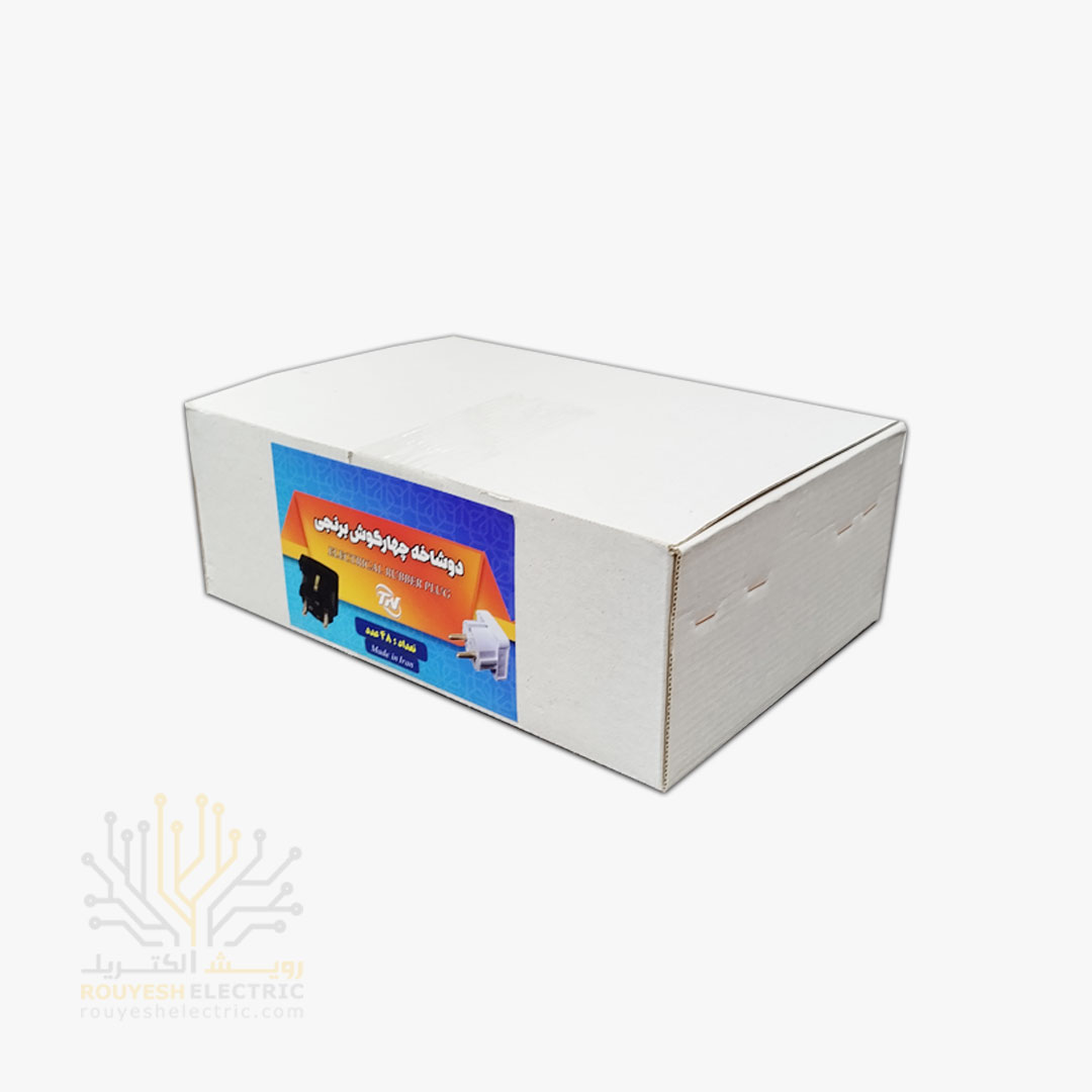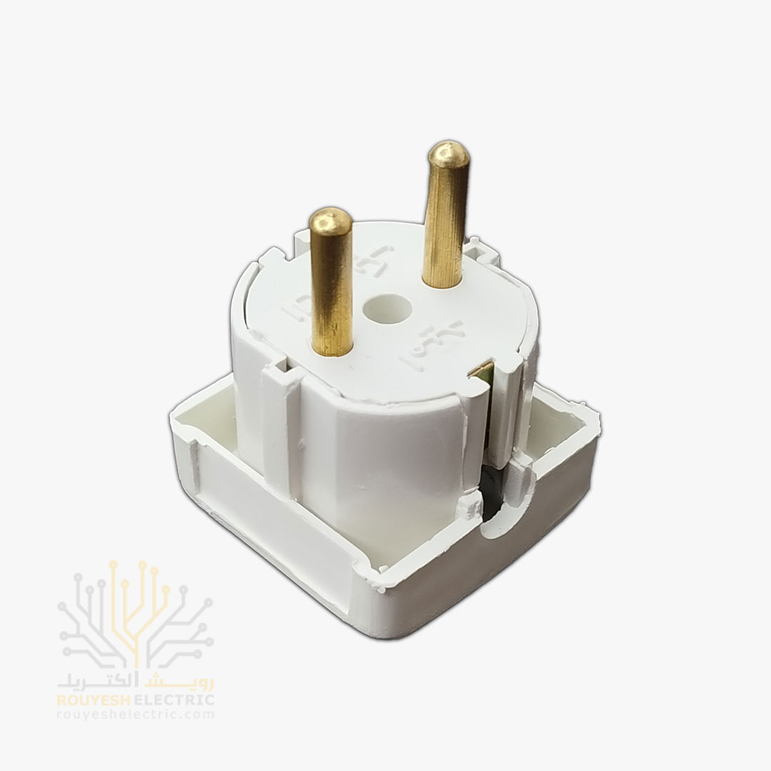 دوشاخه برق یه قطعه‌ی کوچیکه که به انتهای سیم وسایل برقی وصل می‌شه و جریان برق رو از پریز به دستگاه منتقل می‌کنه.  این نوع دوشاخه معمولاً برای اتصال دستگاه‌های برقی به پریزهای خاصی که با این طراحی سازگار هستند، استفاده می‌شود. جنس برنجی میله‌ها استحکام و هدایت الکتریکی خوبی را فراهم می‌کند.