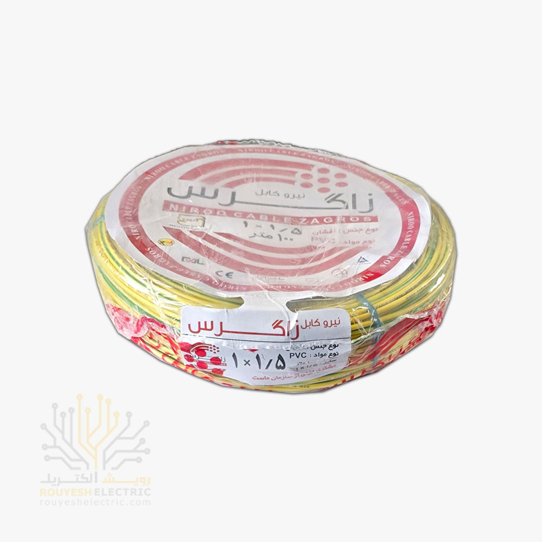 سیم برق نمره 1x1/5 برند نیرو کابل زاگرس استاندارد حلقه 100 متری رنگ ارت موجود در شرکت ما تولید کشور ایران می‌باشد از جمله مزایای این محصول می‌توان به استاندارد بودن ، تنوع در رنگ ، نرم و انعطاف‌پذیر بودن مغزی مسی ، روشن بودن رنگ مس و روکش پلاستیکی با کیفیت اشاره کرد. این محصول دارای ضمانت سلامت محصول است که اطمینان خاطر مشتریان را نسبت به کیفیت جنس خریداری شده فراهم می‌سازد.