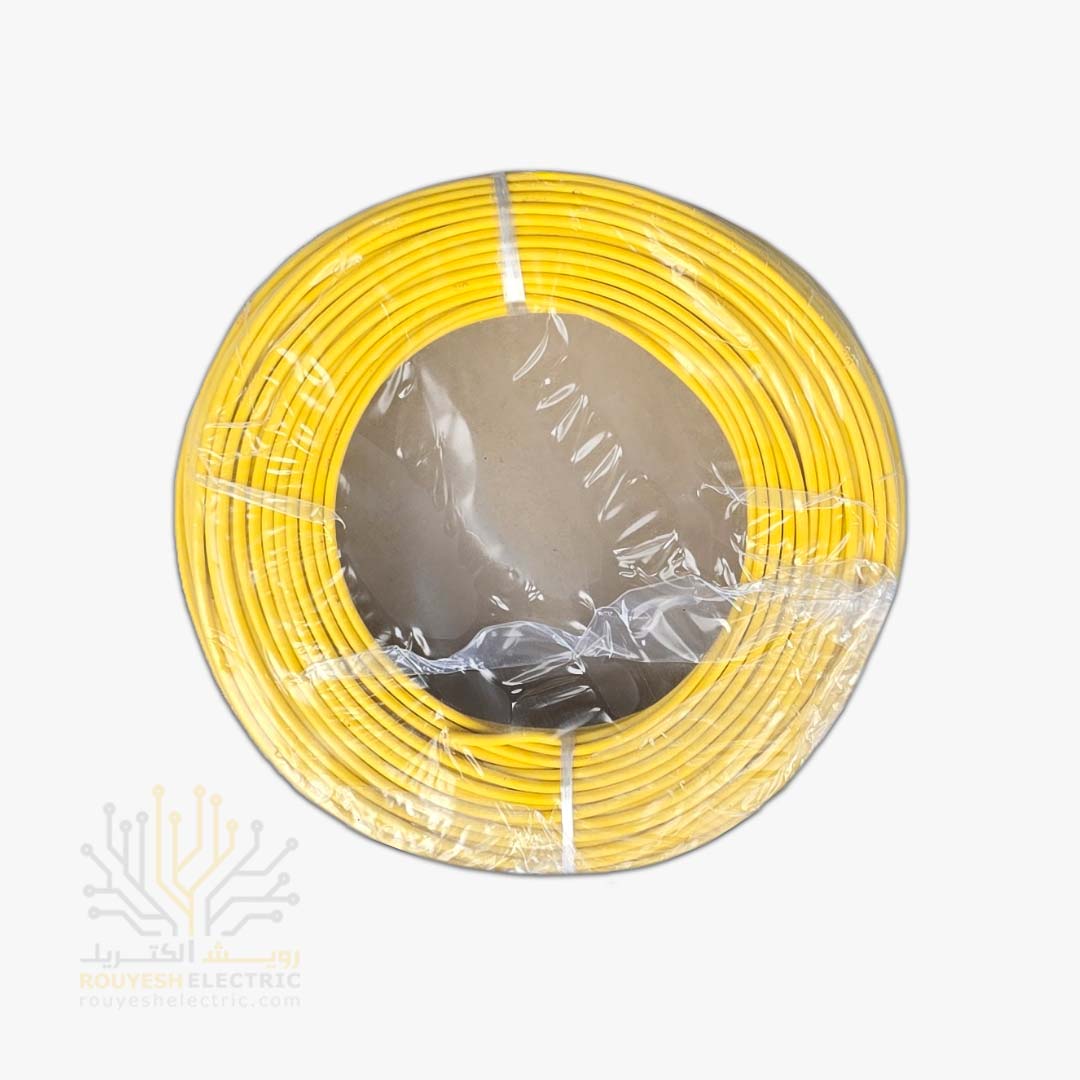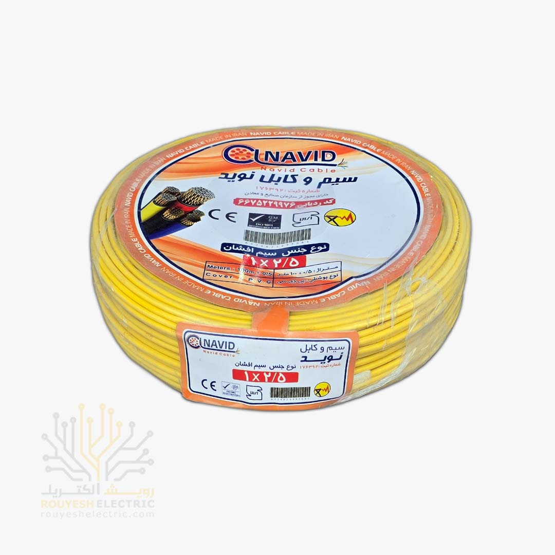 سیم برق نمره 1x2/5 برند نوید استاندارد رنگ زرد حلقه 100 متری