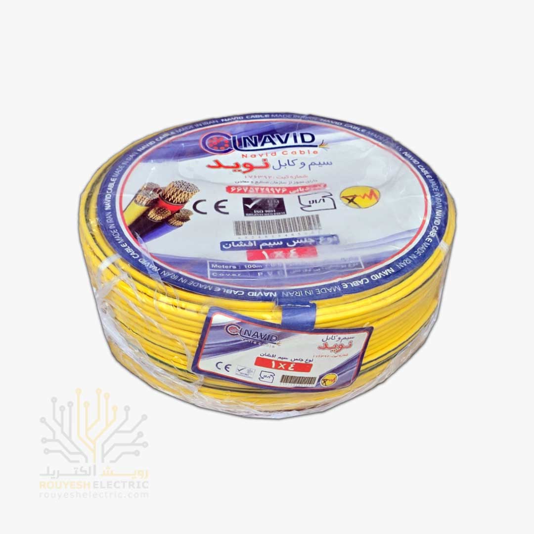 سیم برق نمره 1x4 برند نوید استاندارد رنگ ارت حلقه 100 متری