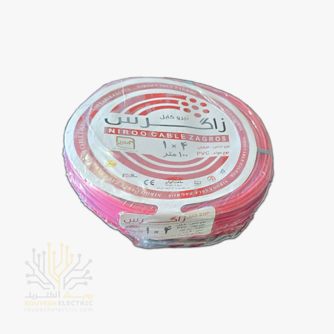 سیم برق نمره 1x4 برند نیرو کابل زاگرس استاندارد حلقه 100 متری رنگ قرمز موجود در شرکت ما تولید کشور ایران می‌باشد از جمله مزایای این محصول می‌توان به استاندارد بودن ، تنوع در رنگ ، نرم و انعطاف‌پذیر بودن مغزی مسی ، روشن بودن رنگ مس و روکش پلاستیکی با کیفیت اشاره کرد. این محصول دارای ضمانت سلامت محصول است که اطمینان خاطر مشتریان را نسبت به کیفیت جنس خریداری شده فراهم می‌سازد.
