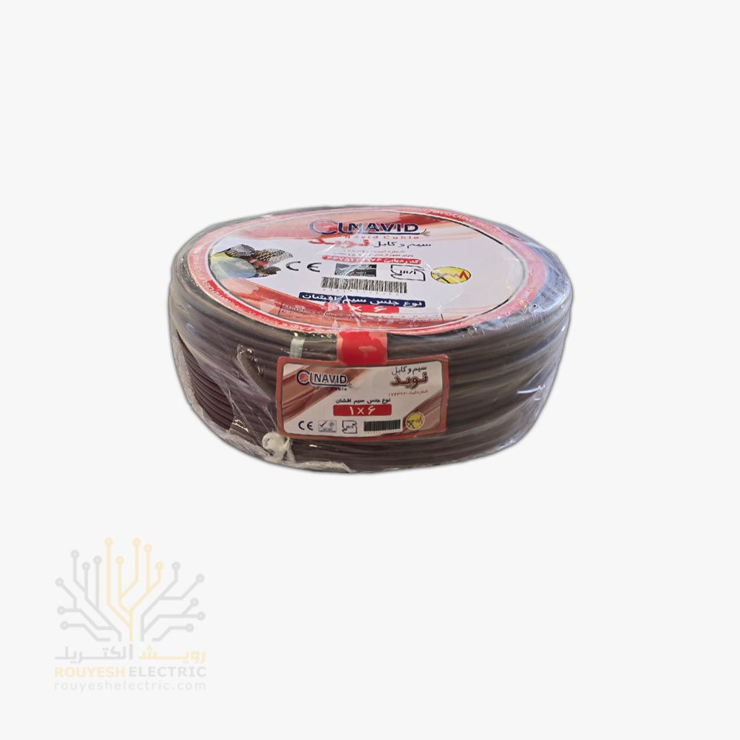 سیم برق نمره 1x6 برند نوید استاندارد رنگ قهوه ای حلقه 100 متری