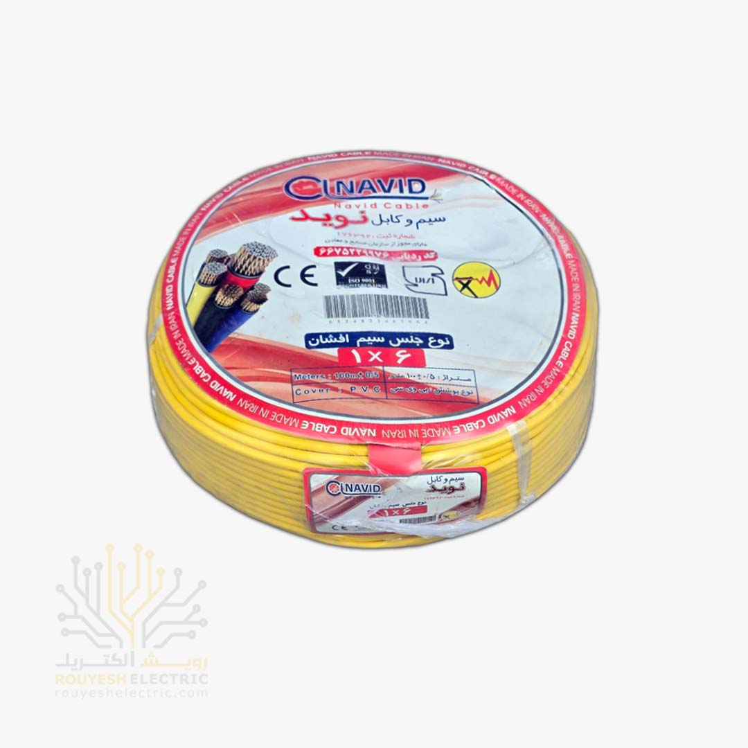 سیم برق نمره 1x6 برند نوید استاندارد رنگ زرد حلقه 100 متری
