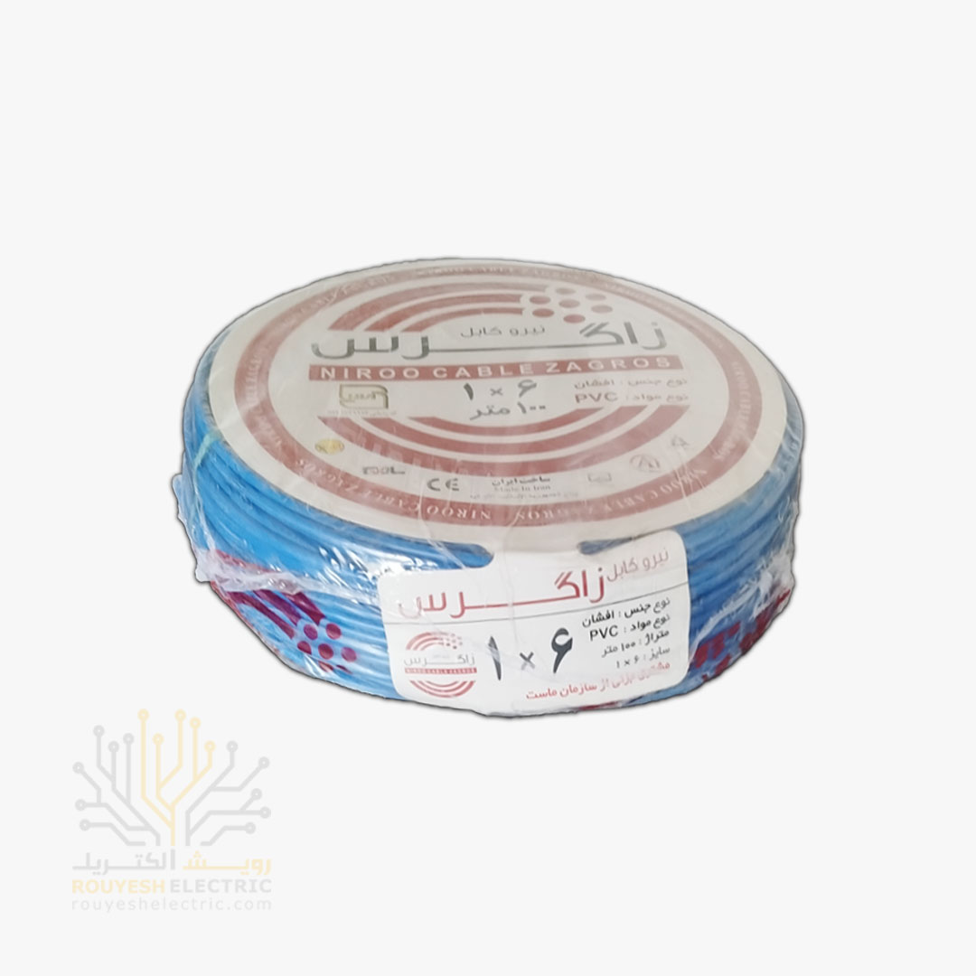 سیم برق نمره 1x6 برند نیرو کابل زاگرس استاندارد حلقه 100 متری رنگ آبی موجود در شرکت ما تولید کشور ایران می‌باشد از جمله مزایای این محصول می‌توان به استاندارد بودن ، تنوع در رنگ ، نرم و انعطاف‌پذیر بودن مغزی مسی ، روشن بودن رنگ مس و روکش پلاستیکی با کیفیت اشاره کرد. این محصول دارای ضمانت سلامت محصول است که اطمینان خاطر مشتریان را نسبت به کیفیت جنس خریداری شده فراهم می‌سازد.