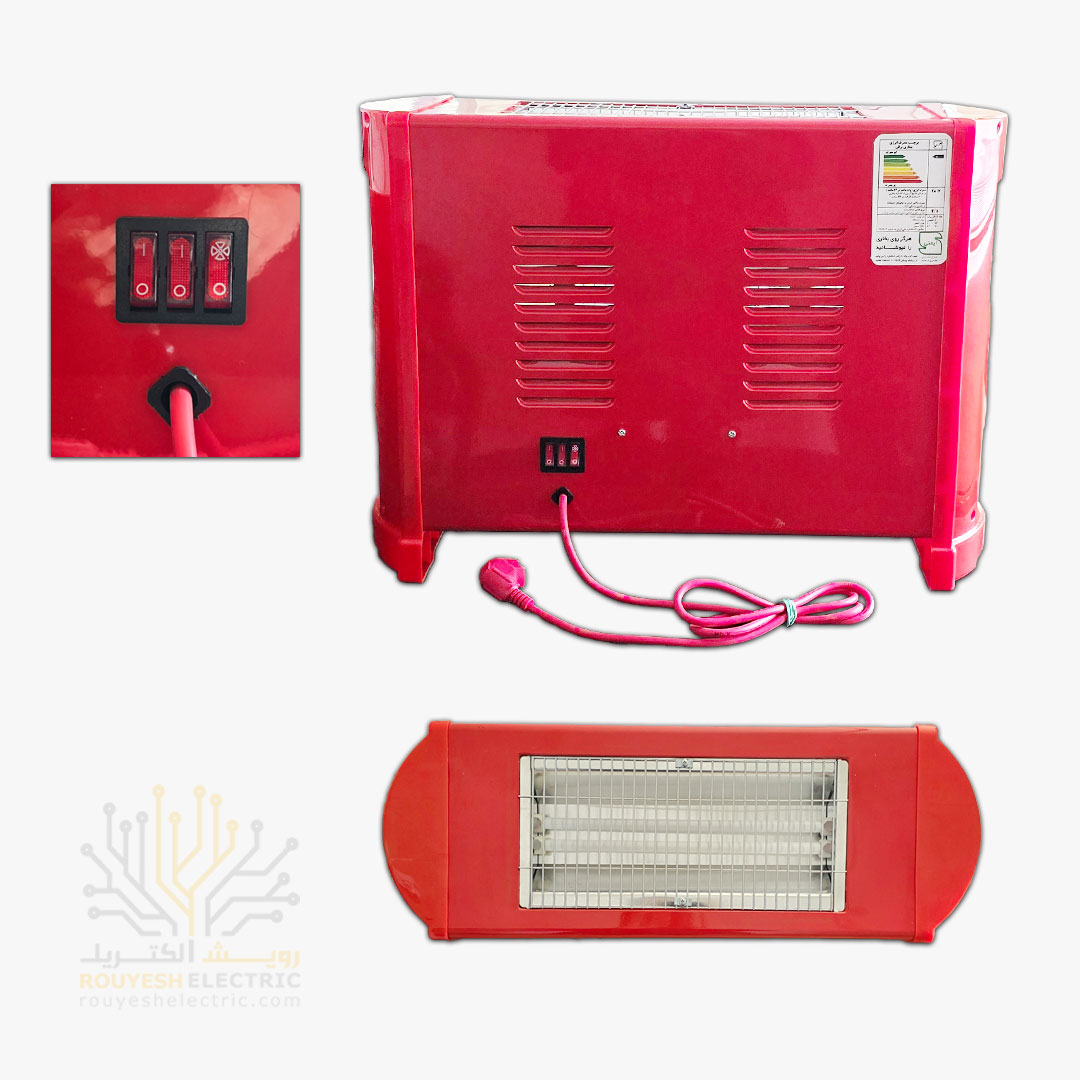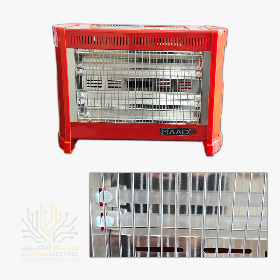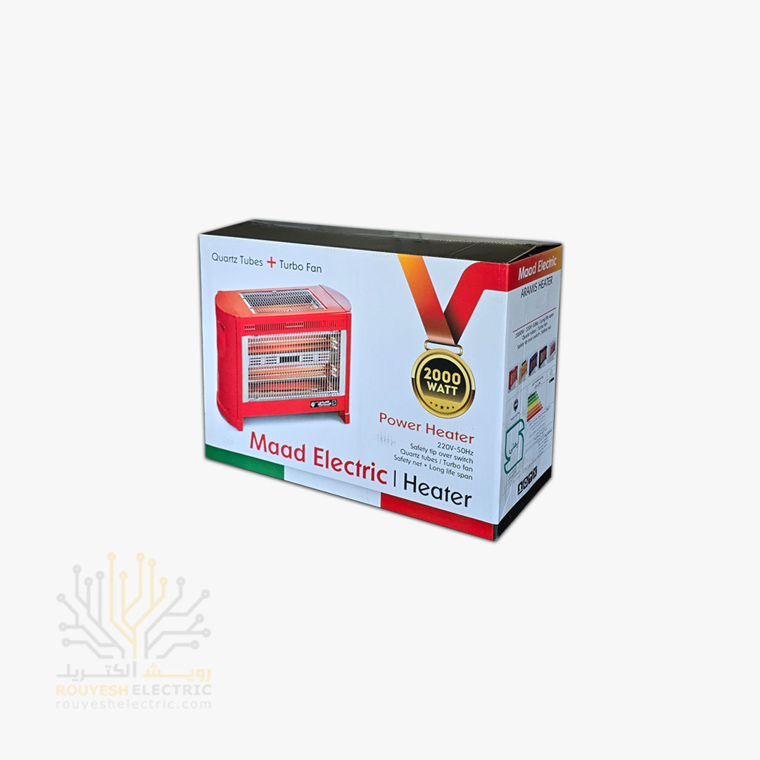 بخاری برقی استاندارد برند ماد الکتریک مدل رویال 4 شعله 2000 وات فن دار بدنه قرمز