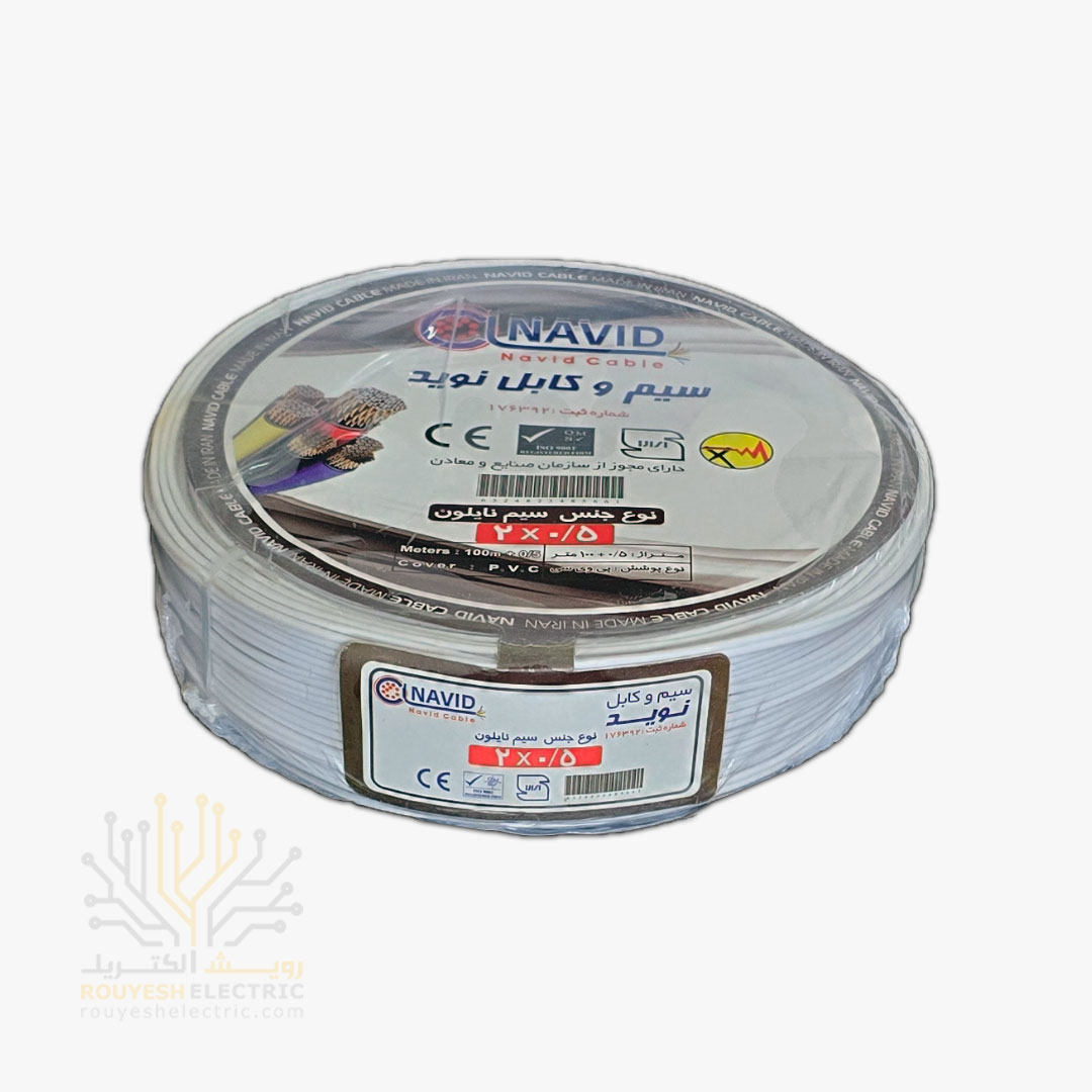 کابل برق نمره 2x0/75 برند نوید استاندارد حلقه 100 متری