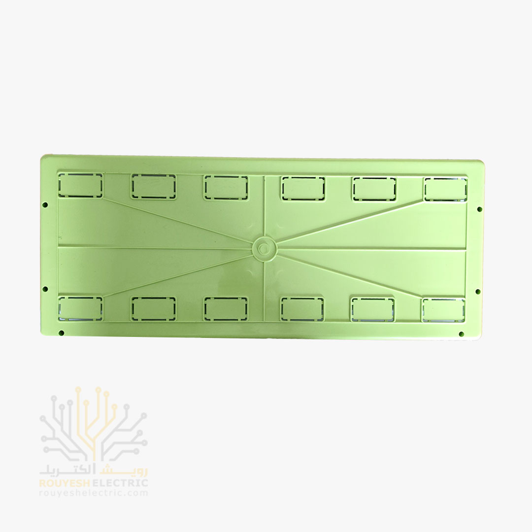 این جعبه فیوز طراحی مستطیلی و بدنه‌ای از پلاستیک مقاوم داره که هم سبک و هم بادوامه. ابعادش حدود ۴۹ در ۲۲ در ۱۱ سانتی‌متره و وزنش حدود ۱۰۵۰ گرمه. رنگ سبز بدنه در کنار درب سفیدش جلوه‌ای تمیز و مرتب ایجاد کرده. داخلش فضای کافی برای مونتاژ راحت داره و دو محل مخصوص برای نصب شینه ارت و نول در نظر گرفته شده. درب دودی شفافش تا زاویه ۱۸۰ درجه باز می‌شه که دسترسی به داخل رو آسون‌تر می‌کنه. بسته‌بندیش مقوایی و مقاومه و هر بسته شامل یه عدد از محصوله؛ در هر کارتن هم ۲۴ بسته قرار داره.