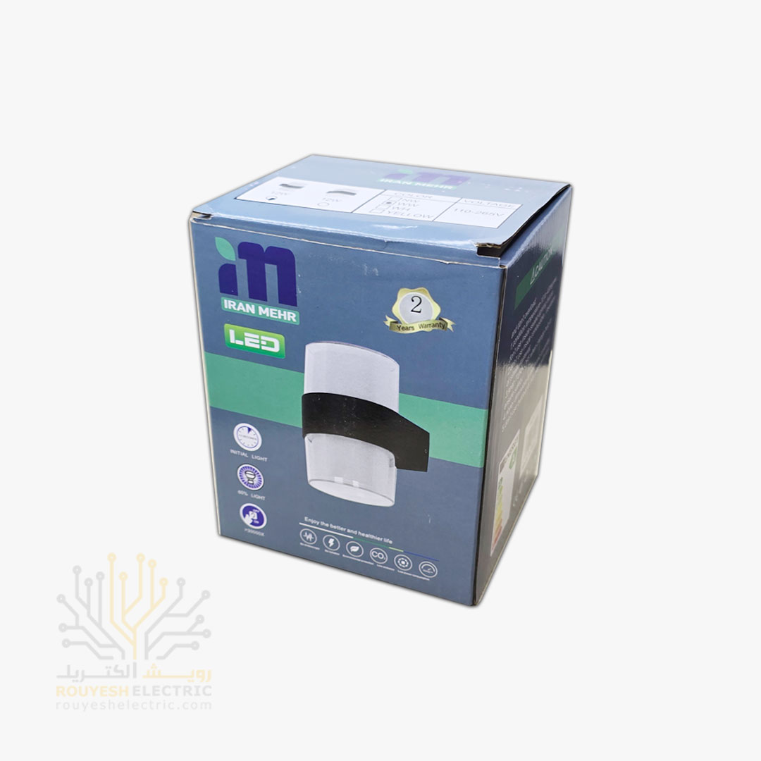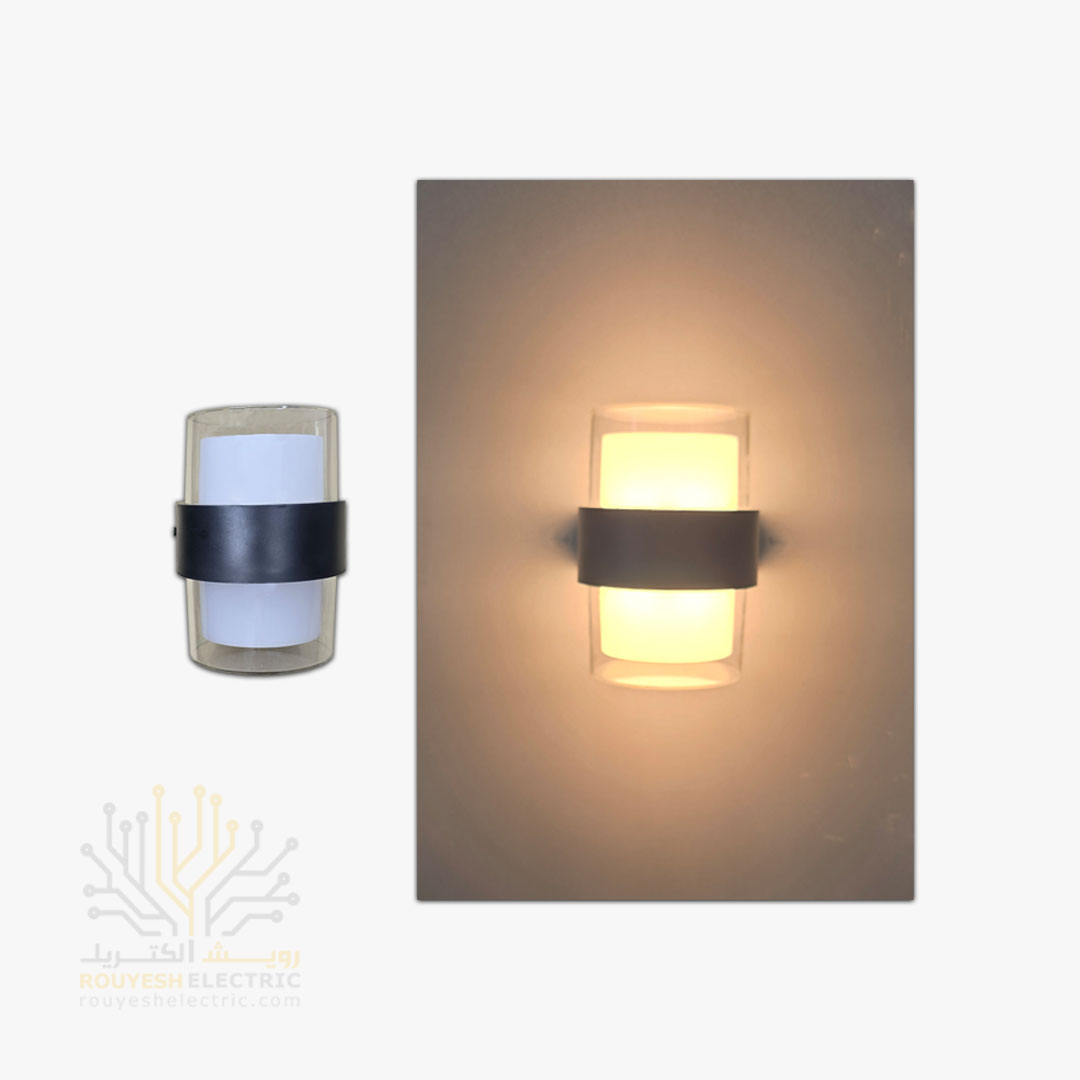 چراغ دیواری دکوراتیو 12 وات برند ایران مهر مدل استوانه دو طرفه کد ایران 19 بدنه مشکی نور یخی