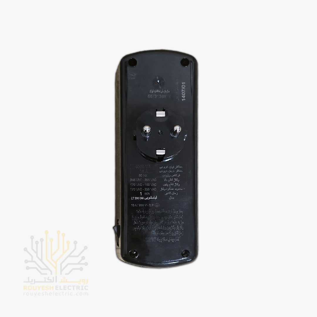 محافظ برق لباسشویی و ظرفشویی دیواری تک خانه برند فروزش مدل LT100 لوتوس ارتدار کلید دار بدنه مشکی آنالوگ