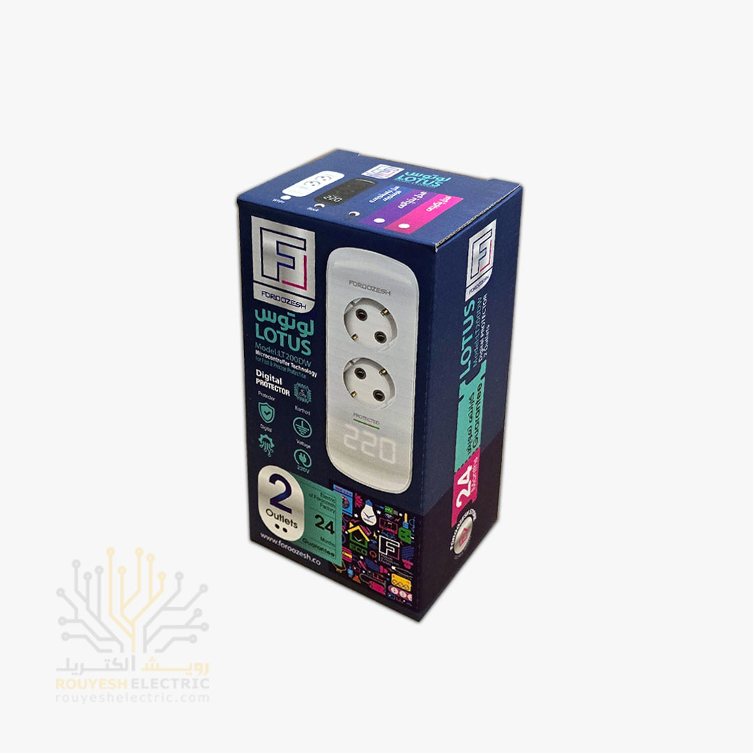 محافظ برق لباسشویی و ظرفشویی برند فروزش مدل LT200 لوتوس ارتدار کلید دار دو خانه دیجیتال بدنه سفید دیواری